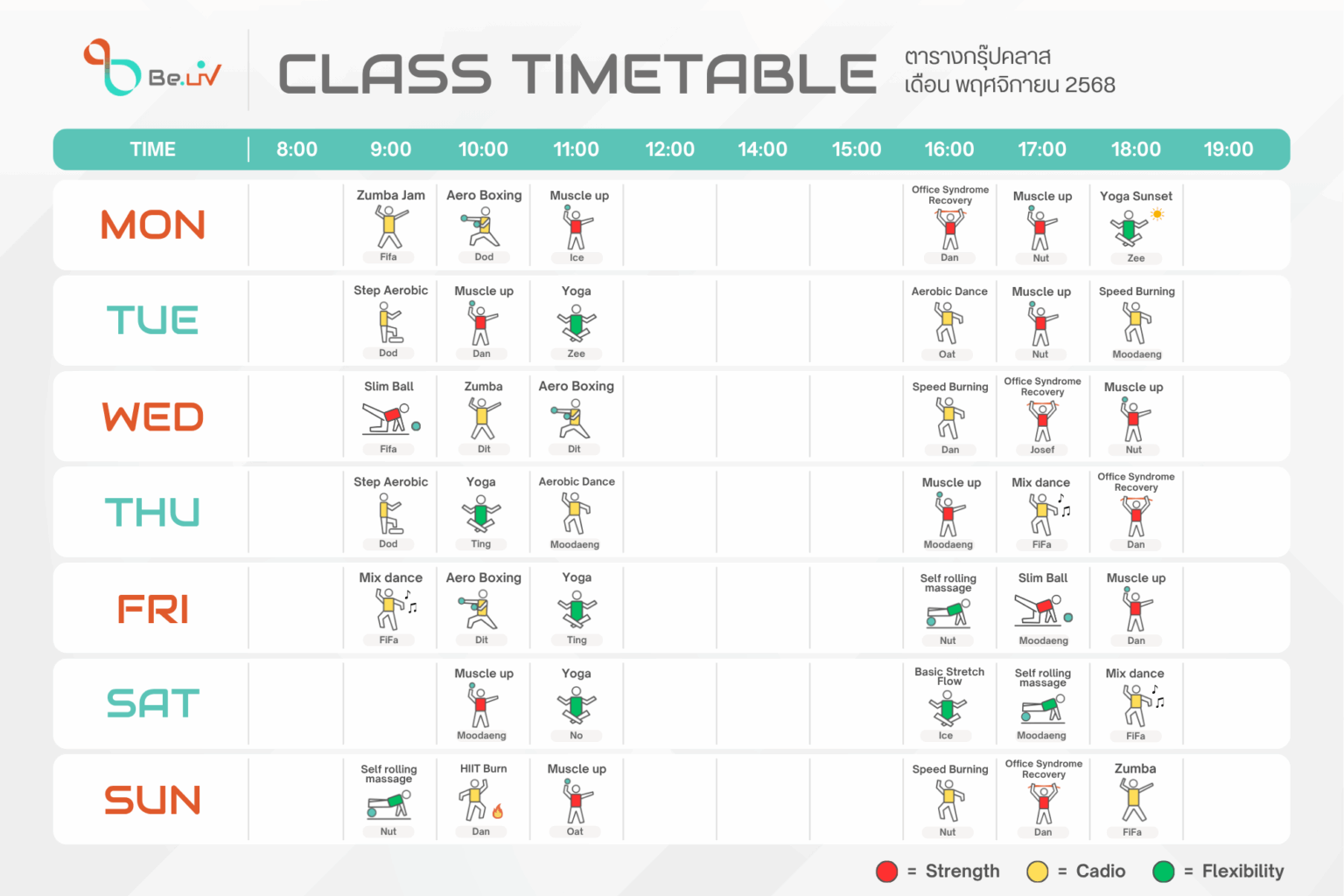 This class focuses on a variety of dance techniques blended with Thai, international, and contemporary music to enhance cardiovascular and circulatory systems. Simple movements performed to music help improve flexibility, strength, and muscle tone. The class is suitable for all fitness levels and for those who enjoy exercising to music, combining mindfulness with movement and promoting overall body balance.